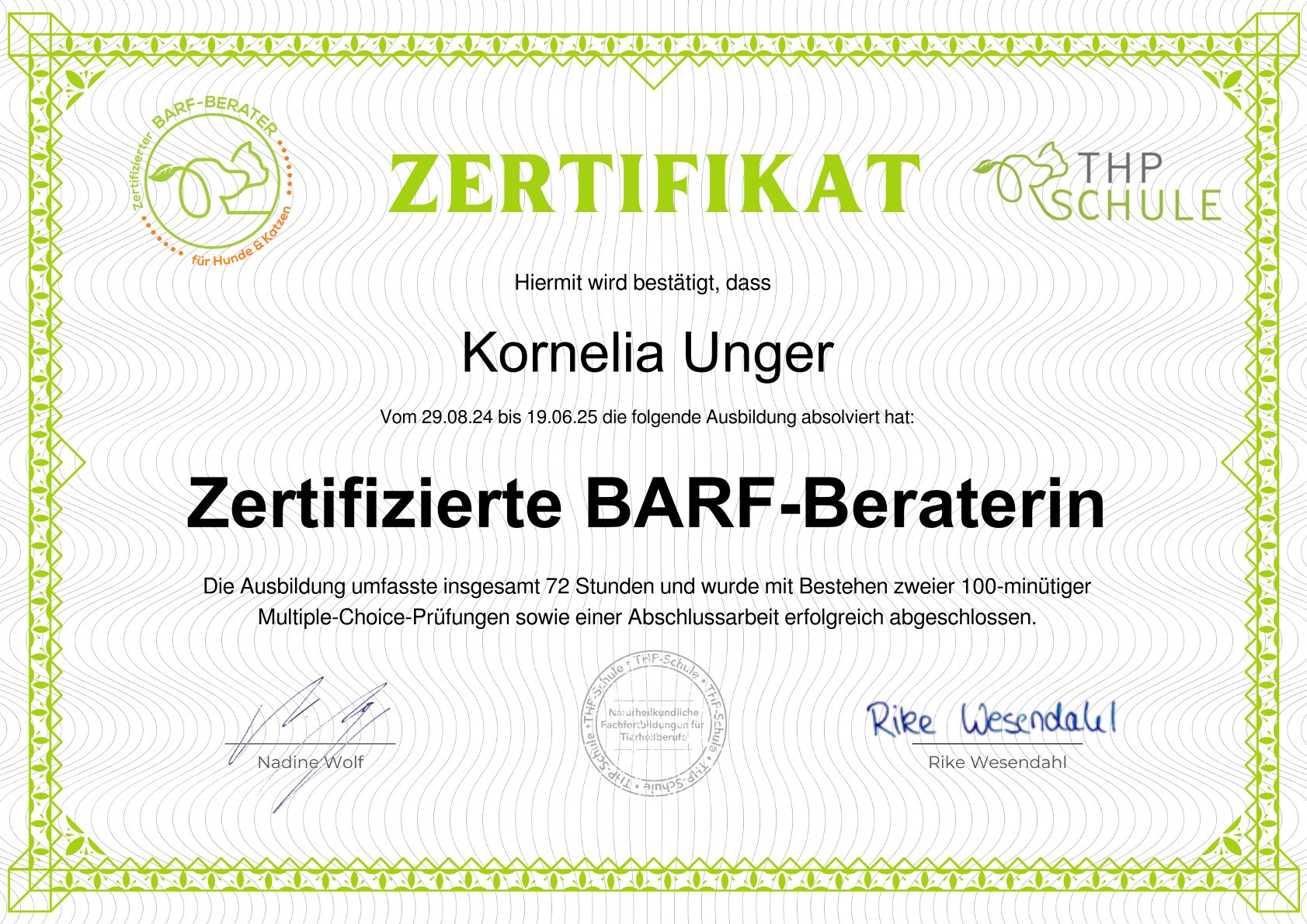 Um mein Wissen auf eine fundierte Basis zu stellen, absolvierte ich eine umfassende Ausbildung an der THP-Schule, die eine tiefgehende Auseinandersetzung mit den Zusammenhängen zwischen Fütterung, Gesundheit und Verhalten beinhaltete.